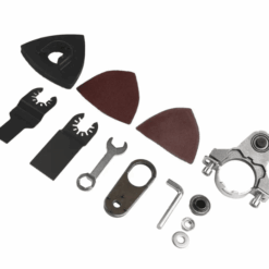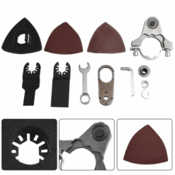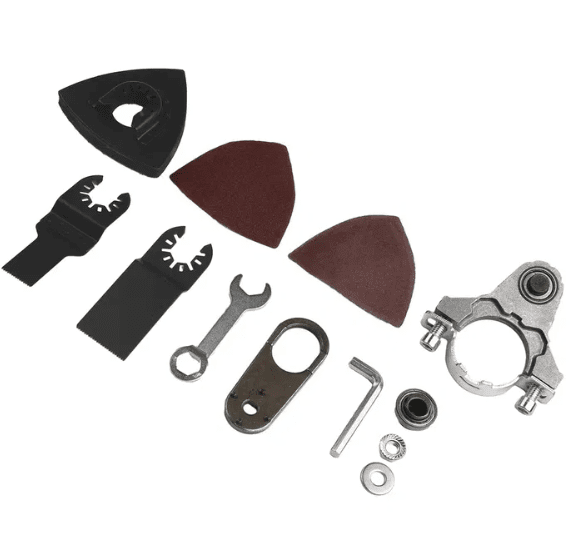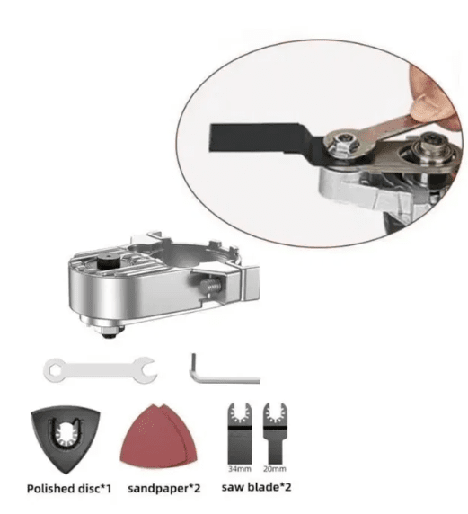 Αυτό το σετ περιλαμβάνει μια πολυλειτουργική κεφαλή, μια τριγωνική βάση λείανσης, μια λάμα πριονιού από χάλυβα υψηλής περιεκτικότητας σε άνθρακα, μια λάμα πριονιού ακριβείας, ένα εξάγωνο κλειδί (Άλεν), ροδέλα, 3 τετράγωνα παξιμάδια και 2 γυαλόχαρτα με πλέγμα 120. Ένα σετ που καλύπτει όλες τις ανάγκες σας.