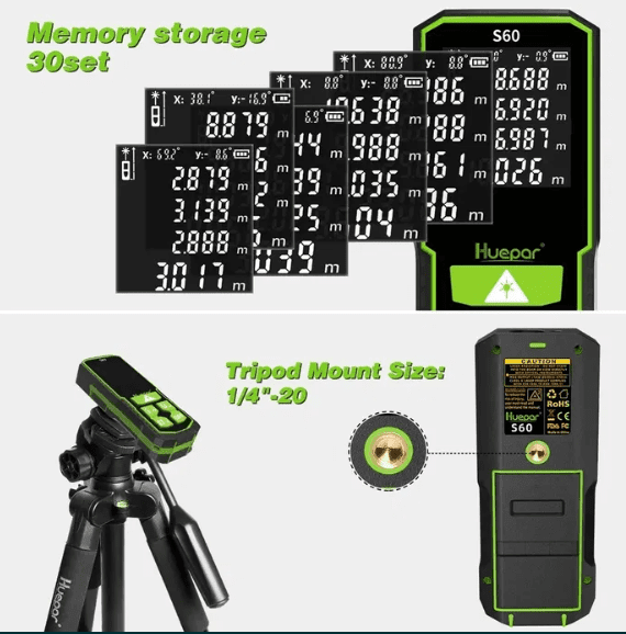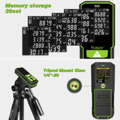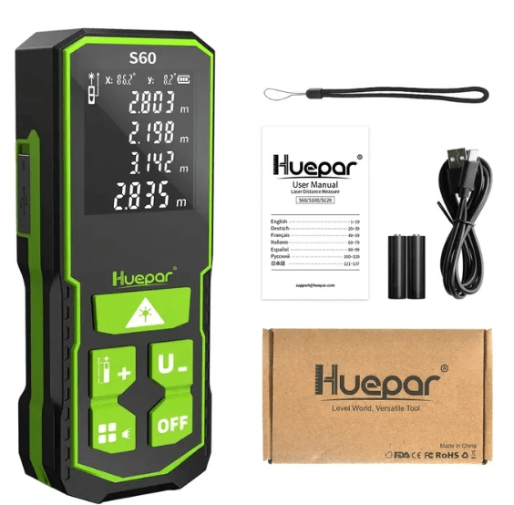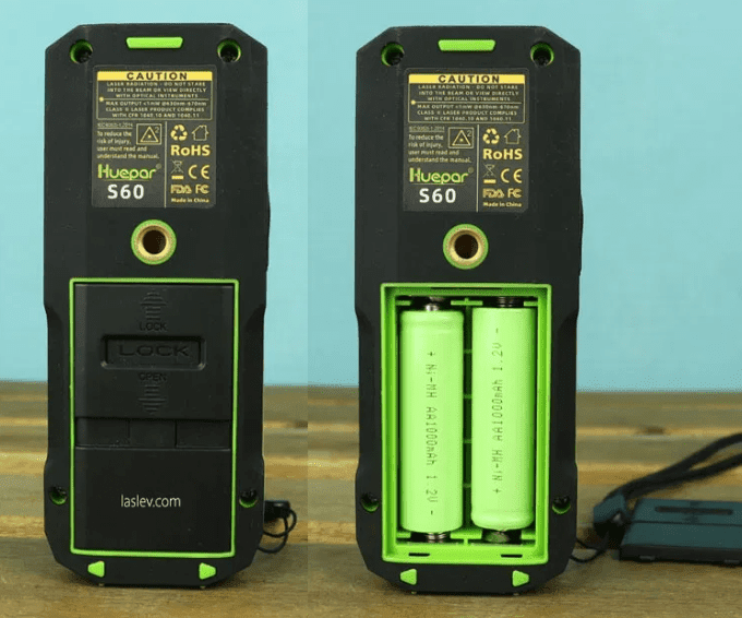 Τα κουμπιά έχουν ισορροπημένη απόκριση με χαρακτηριστικό κλικ. Στο μπροστινό μέρος υπάρχουν δύο παράθυρα: ένας μεγάλος δέκτης λέιζερ και ένα μικρότερο από όπου εξέρχεται η δέσμη. Παρά τη σχετικά μικρή διάμετρο του παραθύρου του δέκτη, το Huepar S60 μετρά σχεδόν ακαριαία σε εσωτερικούς χώρους. Στο πίσω μέρος διαθέτει σπείρωμα 1/4″, χαρακτηριστικό σπάνιο για αποστάσιομετρα υψηλής κατηγορίας. Διαθέτει θήκη για δύο μπαταρίες AA (LR6) ή επαναφορτιζόμενες του ίδιου τύπου, οι οποίες μπορούν να φορτιστούν απευθείας στη συσκευή μέσω θύρας Type-C.