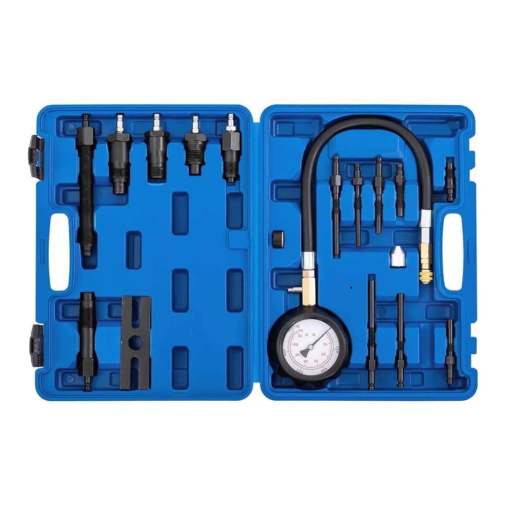 Με τη συσκευή αυτή εντοπίζονται εύκολα προβλήματα όπως φθαρμένες βαλβίδες, ελατήρια εμβόλων, οδηγοί, τσιμούχες και φλάντζες κυλινδροκεφαλής. Το μανόμετρο με διπλή κλίμακα (0-1000 psi / 0-70 bar) και το σύστημα ταχείας απελευθέρωσης εξασφαλίζουν άνεση, ασφάλεια και επαγγελματικά αποτελέσματα σε κάθε έλεγχο.