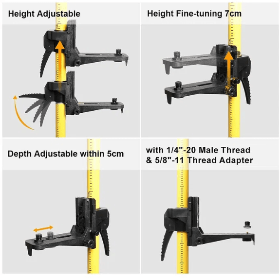 Η βάση στήριξης με σπείρωμα 1/4″-20 και προσαρμογέα 5/8″-11 είναι συμβατή με τα περισσότερα γραμμικά και περιστροφικά λέιζερ. Η πλάκα της βάσης και της κεφαλής διαθέτουν αντιολισθητική επιφάνεια, ενώ η περιοχή υψηλότερης πίεσης ενισχύει τη στερέωση και στα δύο άκρα. Ο στύλος τοποθέτησης λέιζερ διαθέτει ελατηριωτή βάση για γρήγορη και εύκολη ρύθμιση της τάσης. Το ισχυρό ελατήριο 5 cm παρέχει μεγαλύτερο εύρος ρύθμισης και πιο σταθερή στερέωση. Τα ανθεκτικά πεντάλ ποδιού επιτρέπουν ευκολότερη και ασφαλέστερη εργασία.
