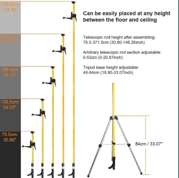 Οι συνδέσεις είναι ευανάγνωστες και σημειωμένες με μαύρο χρώμα πάνω στον κίτρινο στύλο σε ίντσες και εκατοστά. Πρόκειται για ένα απαραίτητο εργαλείο για κάθε εργοτάξιο, καθώς επιτρέπει την τοποθέτηση των οργάνων σε οποιοδήποτε ύψος μεταξύ δαπέδου και οροφής. Το ύψος εργασίας είναι 370 cm όταν συναρμολογηθεί πλήρως με όλα τα τμήματα και τα δύο ακραία μέρη.